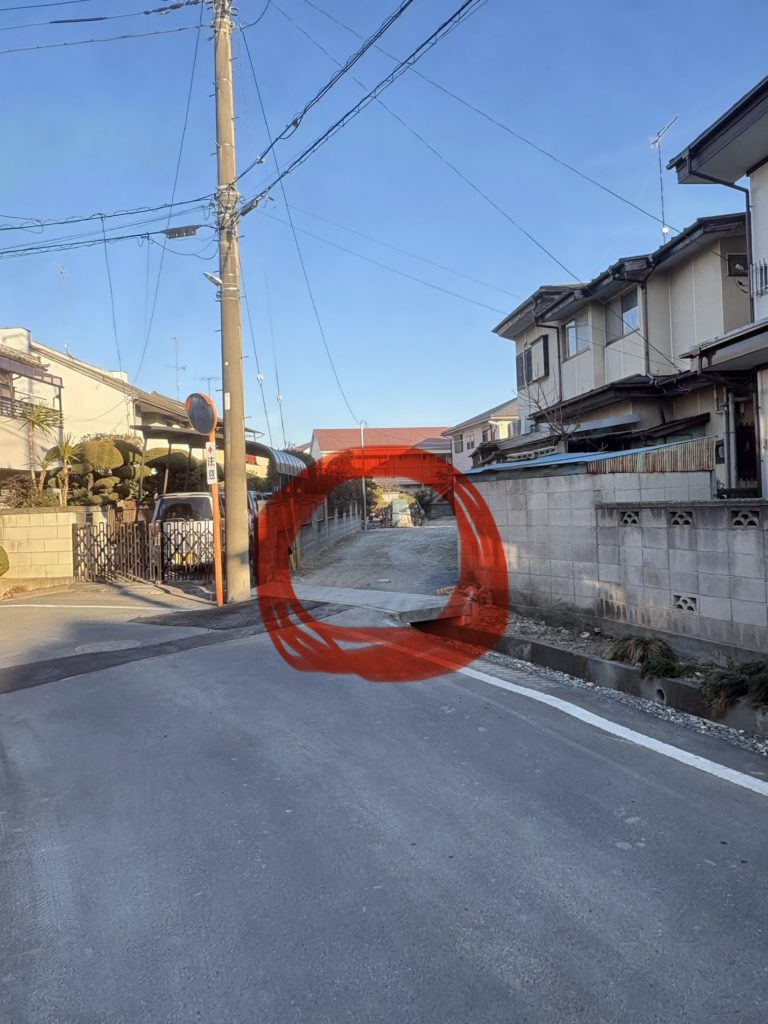 ※奥に進むと、敷地が広がります。敷地が広がると軽自動車が一台停まっていますのでその隣にお停めください。